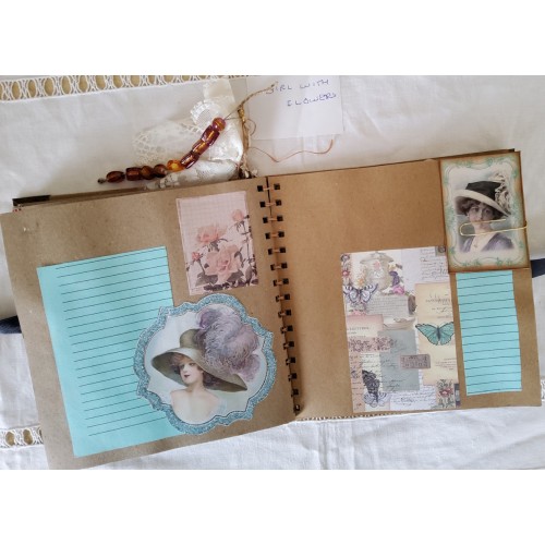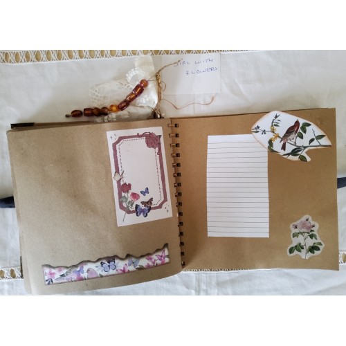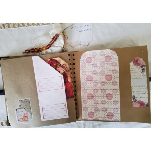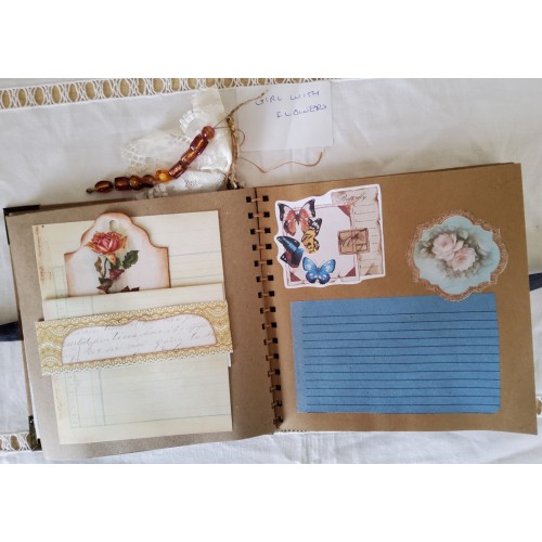 Cord bound kraft paper for you to add to for many years to come, ribbon ties and a lace and bead bookmark complete this unique scrapbook journal.